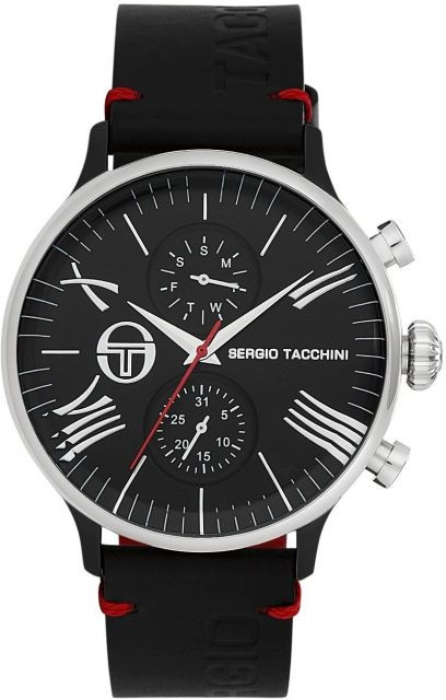 Спортно-елегантен мъжки часовник Sergio Tacchini с мултифункционален дисплей. Корпус от неръждаема стомана в комбинация с каишка от естествена кожа. Стъкло минерал-кристал. Прецизен кварцов механизъм JP15 CITIZEN MIYOTA произведен в Япония. Водоустойчивост 5 ATM - допускат се леки пръски и взимане на душ, не се препоръчва обилно мокрене.