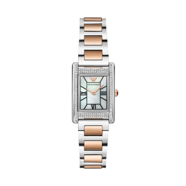 Emporio Armani AR11626 от колекцията Genni е изискан дамски часовник, който съчетава модерна геометрия и луксозен финес. Корпусът е изработен от сребриста неръждаема стомана с правоъгълна форма (North-South ориентация) и размер 32 мм, а верижката е двуцветна (сребристо-златиста) с ширина 16 мм. Перленият циферблат с деликатни стрелки и минималистични индекси създава усещане за класическа женственост и изтънченост. Перфектен аксесоар за всекидневна елегантност или специален повод.