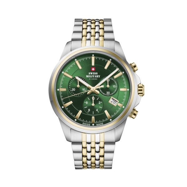 Часовник SWISS MILITARY by CHRONO SM34107.08 е елегантен швейцарски кварцов хронограф с изискан зелен циферблат и двуцветен дизайн. Корпусът и верижката са изработени от благородна стомана с PVD покритие, което подчертава луксозния му характер. Механизмът Ronda 5040.D осигурява прецизност и надеждност, а сапфир кристалът предпазва от надрасквания. Водоустойчив до 10 ATM, този часовник е идеален избор за мъже, които търсят комбинация от стил, функционалност и швейцарско качество.