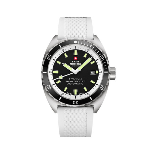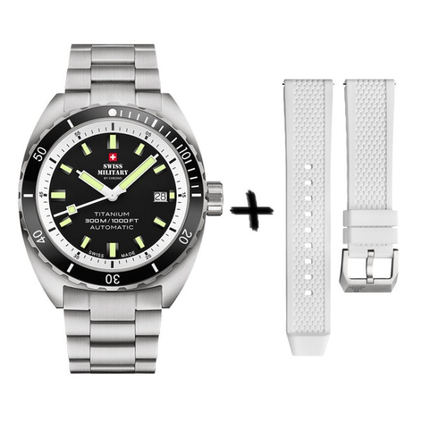 Часовник SWISS MILITARY by CHRONO SMA34100.02SET WHITE е швейцарски автоматичен модел с модерен спортен характер и изключителна издръжливост. Сетът включва часовник с титанова верижка и допълнителна бяла силиконова каишка. Черният циферблат създава контрастен и елегантен вид, а титановият корпус осигурява лекота и устойчивост. Сапфир кристалът предпазва от надрасквания, а 30 ATM водоустойчивост гарантира надеждност дори при активен начин на живот.