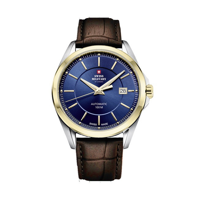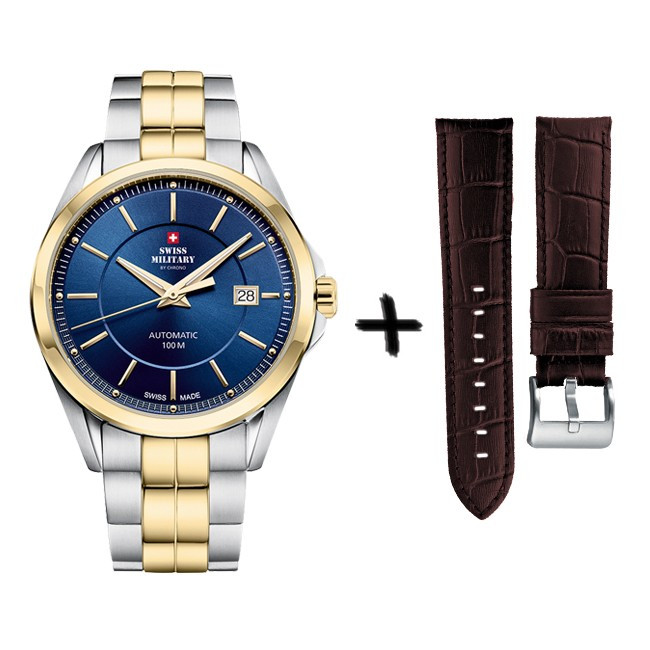 Часовник SWISS MILITARY by CHRONO SMA34085.07SET е изискан швейцарски автоматичен модел със син циферблат и елегантен двуцветен корпус. Сетът включва часовник с верижка от благородна стомана и допълнителна кафява кожена каишка. Сапфир кристалът осигурява отлична защита от надрасквания, а механизмът Sellita SW200 Standard гарантира прецизност и дълъг живот. Водоустойчив до 10 ATM, този модел впечатлява с баланс между спортна функционалност и класическа визия.