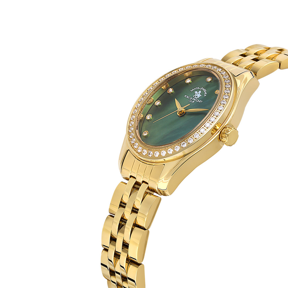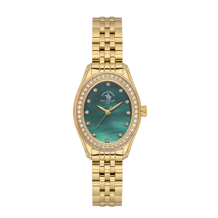 Нежен дамски часовник с красива визия от колекцията Unique. Моделът е със седефен аналогов дисплей в зелен цвят, декориран с кристали по часовите маркери и по безела. Корпусът и верижката са изработени от неръждаема стомана. Стъкло минерал-кристал. Задвижва се от кварцов механизъм 2035. Водоустойчивост 5 ATM - допускат се леки пръски и взимане на душ, не се препоръчва обилно мокрене.