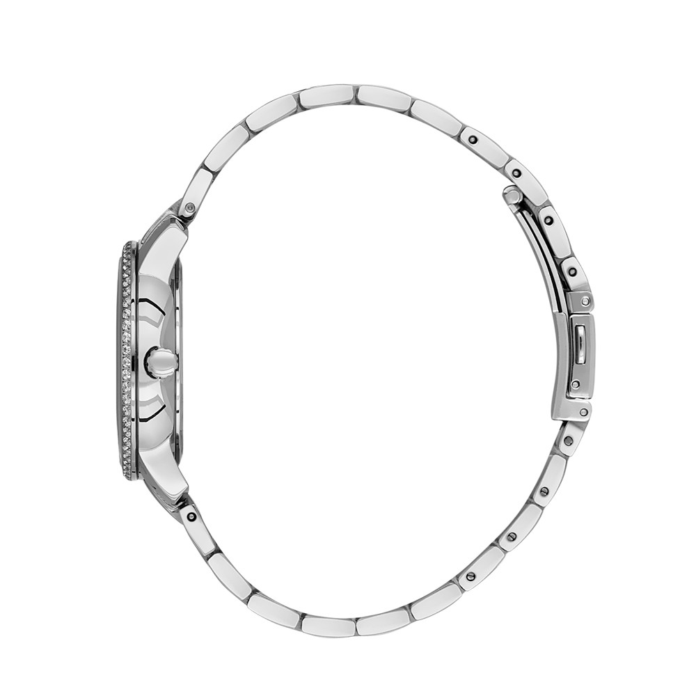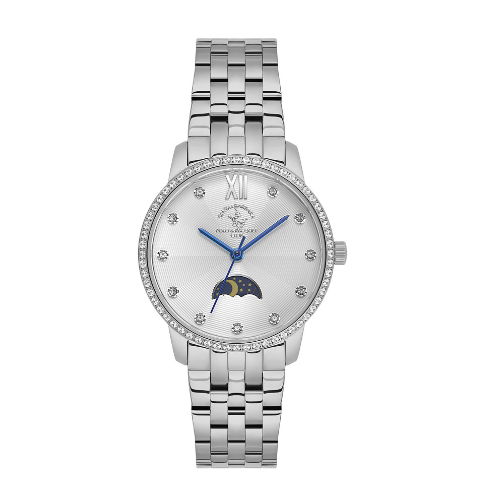 Дамски часовник с нежна визия от колекцията Unique. Моделът е с корпус и верижка от неръждаема стомана. Диаметър на корпуса 32 мм. Часовникът е със сребрист аналогов дисплей с показател за лунна фаза. Красива декорация от инкрустирани кристали по дисплея и безела. Стъкло минерал-кристал. Задвижва се от кварцов механизъм VX3WE11. Водоустойчивост 5 ATM - допускат се леки пръски и взимане на душ, не се препоръчва обилно мокрене.