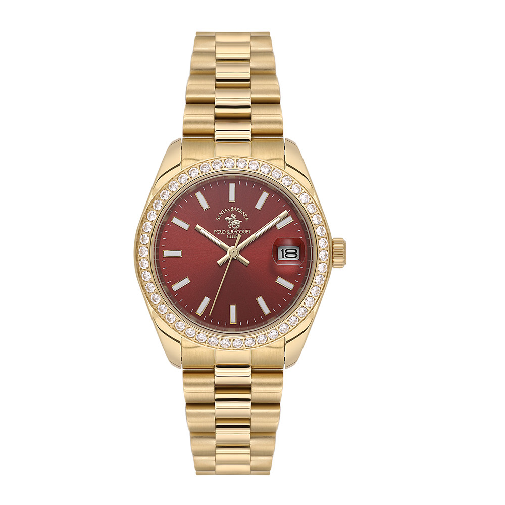 Красив дамски часовник със спортно-елегантна визия от колекцията Unique. Моделът е с корпус и верижка от неръждаема стомана. Диаметър на корпуса 33 мм. Аналогов дисплей в червен цвят с показател за дата. Луминисцентно покритие върху стрелките и индексите. Декорация от нежни кристали по безела. Стъкло минерал-кристал. Задвижва се от кварцов механизъм VX32-3H. Водоустойчивост 5 ATM - допускат се леки пръски и взимане на душ, не се препоръчва обилно мокрене.