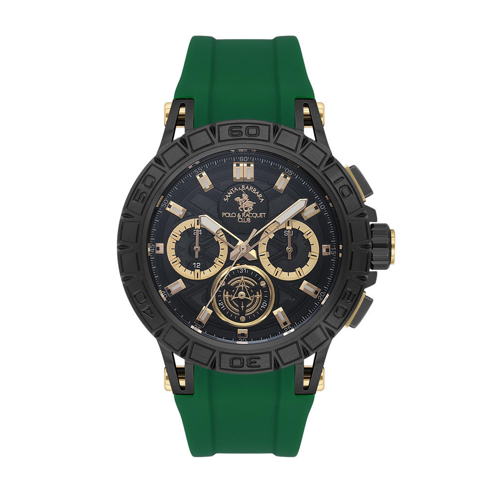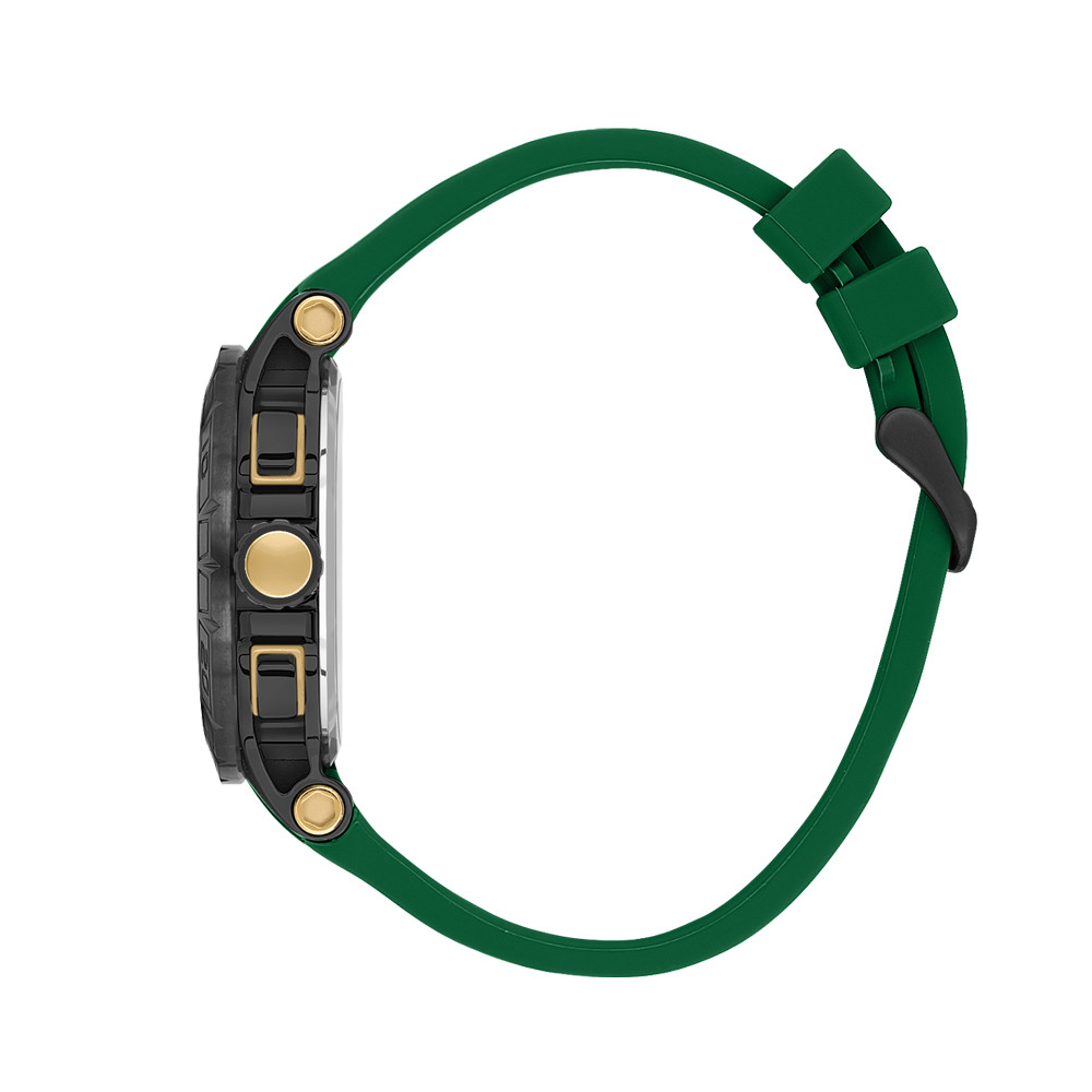 Впечатляващ модел мъжки часовник от колекцията Prive. Корпус изработен от неръждаема стомана. Зелена силиконова каишка. Диаметър на корпуса 45.5 мм. Стъкло минерал-кристал. Черен дисплей хронограф със скелетонизиран дизайн. Часовникът се задвижва от кварцов механизъм VX9J. Водоустойчивост 10 ATM - позволява мокрене, къпане и плуване във водни басейни.