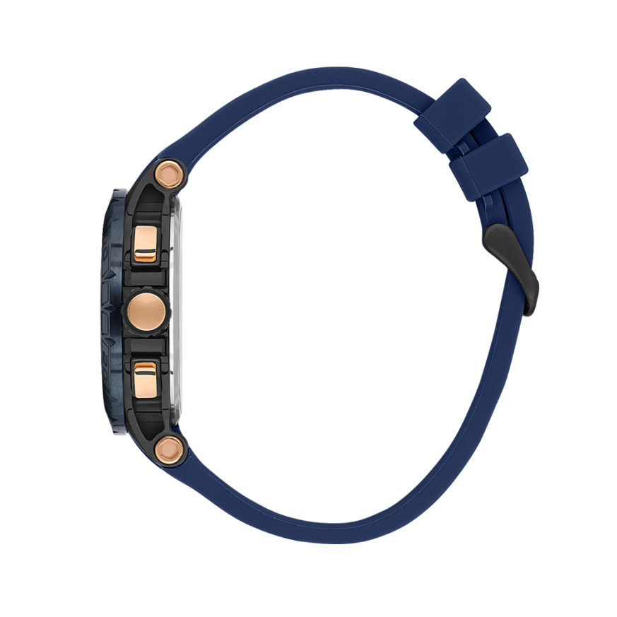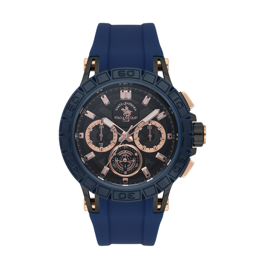 Впечатляващ модел мъжки часовник от колекцията Prive. Корпус изработен от неръждаема стомана. Тъмносиня силиконова каишка. Диаметър на корпуса 45.5 мм. Стъкло минерал-кристал. Черен дисплей хронограф със скелетонизиран дизайн. Часовникът се задвижва от кварцов механизъм VX9J. Водоустойчивост 10 ATM - позволява мокрене, къпане и плуване във водни басейни.