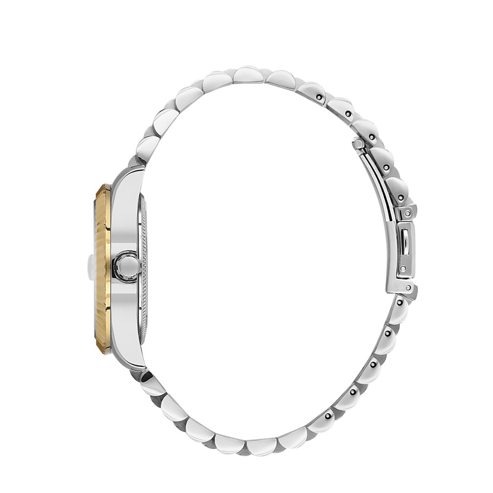 Красив дамски часовник от колекцията Unique. Моделът е с корпус и верижка от неръждаема стомана. Сребрист текстуриран дисплей с декорация от нежни кристали по часовите маркери и с показател за дата. Диаметър на корпуса 34 мм. Стъкло минерал-кристал. Задвижва се от кварцов механизъм. Водоустойчивост 5 ATM - допускат се леки пръски и взимане на душ, не се препоръчва обилно мокрене.