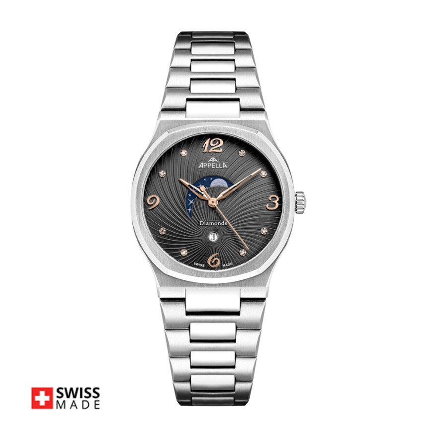 Часовник Appella L32006.51R6DQS впечатлява с изящна комбинация от луксозни детайли и функционалност, създавайки перфектен аксесоар за модерната жена. Тъмносивият циферблат, украсен с 8 диаманта, придава изтънчен блясък, а индикаторите за дата и лунна фаза добавят практичност и уникален характер. Корпусът и верижката от благородна стомана осигуряват устойчивост и комфорт, докато сапфир-кристалът с антирефлексно покритие гарантира защита при ежедневно носене. Швейцарският кварцов механизъм RONDA 788 Swiss Made осигурява надеждна точност.
