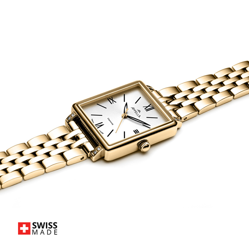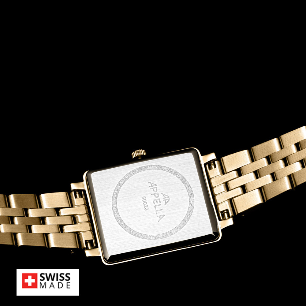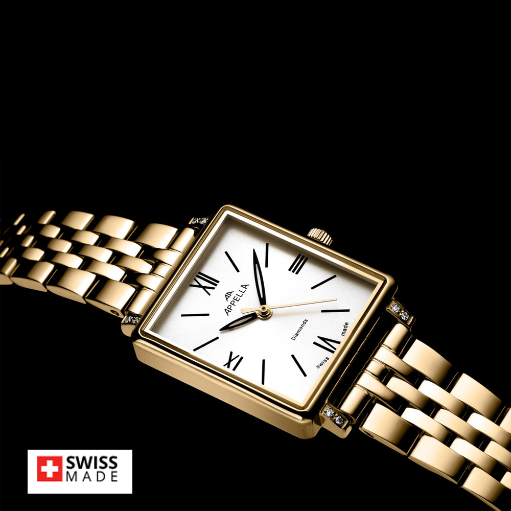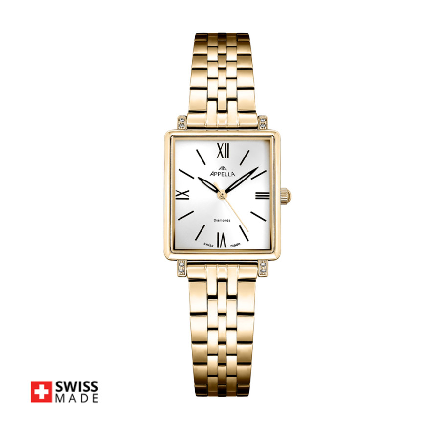 Дамски часовник Appella L50023.1163DQ привлича вниманието със своята елегантност. Корпус и верижка в златист цвят, изработени от неръждаема стомана. Корпусът е украсен с осем диаманта. Моделът е със сребрист циферблат и стъкло сапфир-кристал с антирефлетсно покритие. Задвижва се от кварцов механизъм ETA F04/ RONDA 785 Swiss Made. Водоустойчивост 3 ATM - допускат се леки пръски, не се препоръчва обилно мокрене.