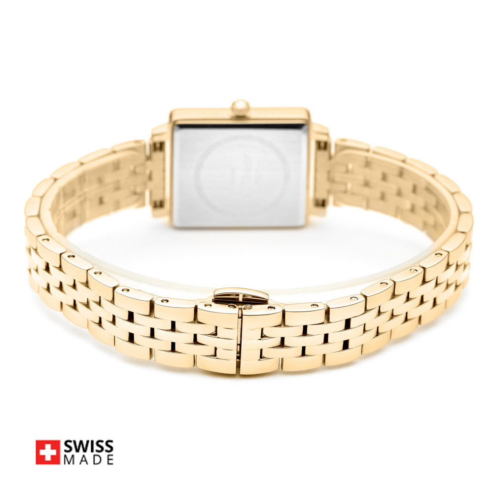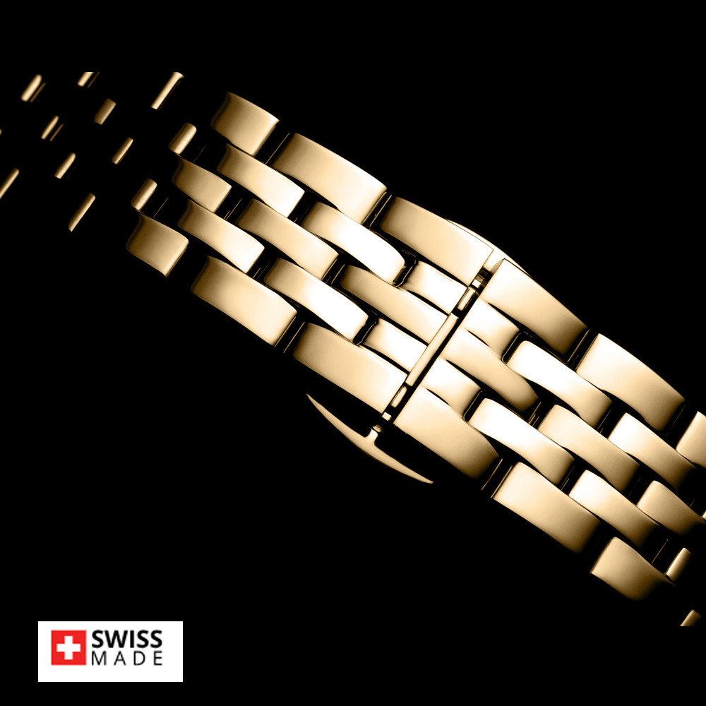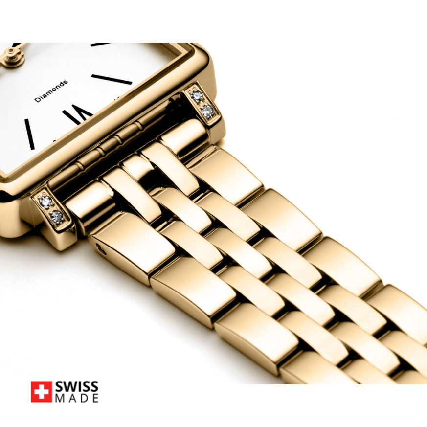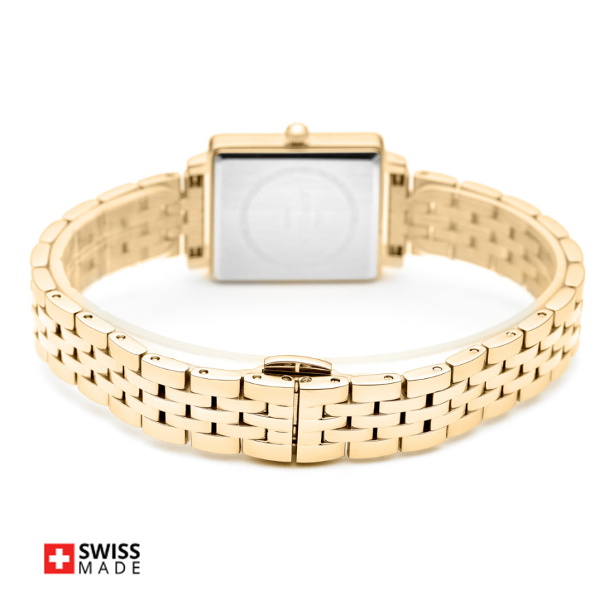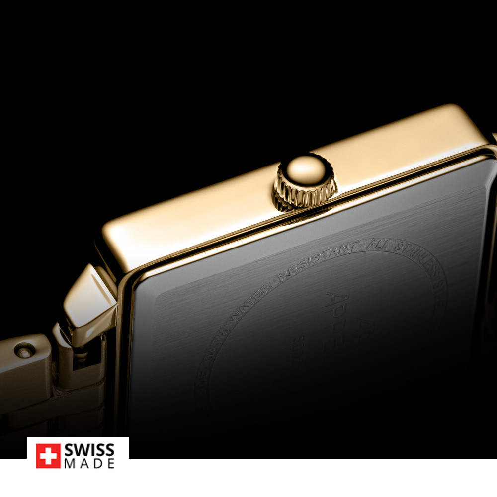 Дамски часовник Appella L50023.1163DQ привлича вниманието със своята елегантност. Корпус и верижка в златист цвят, изработени от неръждаема стомана. Корпусът е украсен с осем диаманта. Моделът е със сребрист циферблат и стъкло сапфир-кристал с антирефлетсно покритие. Задвижва се от кварцов механизъм ETA F04/ RONDA 785 Swiss Made. Водоустойчивост 3 ATM - допускат се леки пръски, не се препоръчва обилно мокрене.