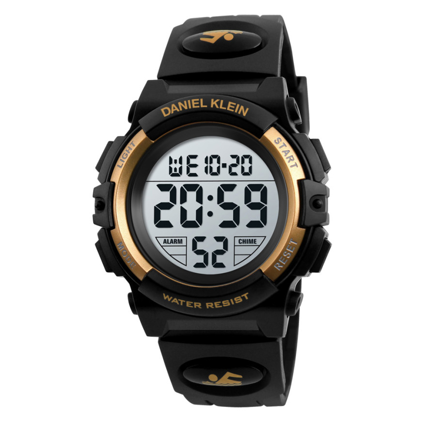 Спортен модел мъжки часовник Daniel Klein с дигитален дисплей. Плексигласово стъкло. Корпус и каишка от полимер. Моделът има следните функции: показател за дата и ден от седмицата, 12/24 часов формат, аларма и осветяване на дисплея. Задвижва се от кварцов механизъм. Водоустойчивост 5 ATM - допускат се леки пръски и взимане на душ, не се препоръчва обилно мокрене.