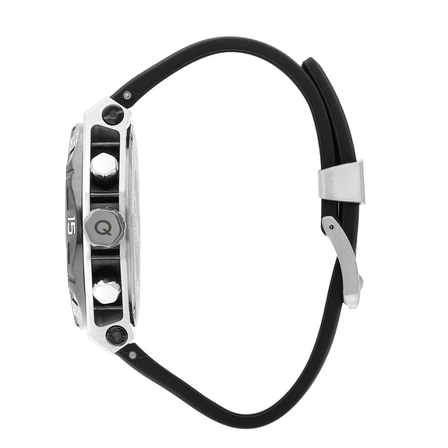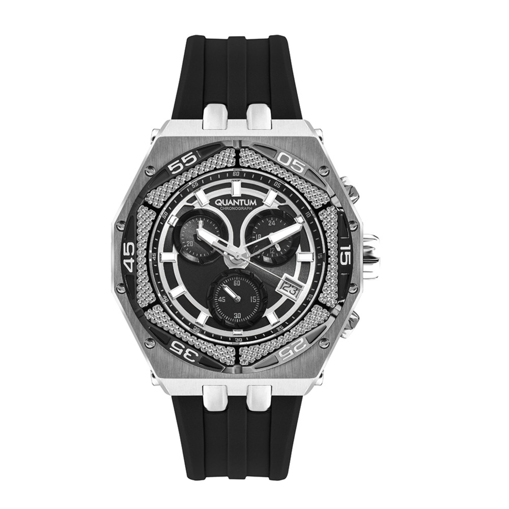 Мъжки часовник Quantum с интересен и модерен дизайн. Моделът е с дисплей хронограф. Стъкло минерал-кристал с антирефлексно покритие. Корпус от неръждаема стомана. Черна силиконова каишка. Задвижва се от кварцов механизъм. Водоустойчивост 10 ATM - позволява мокрене, къпане и плуване във водни басейни.