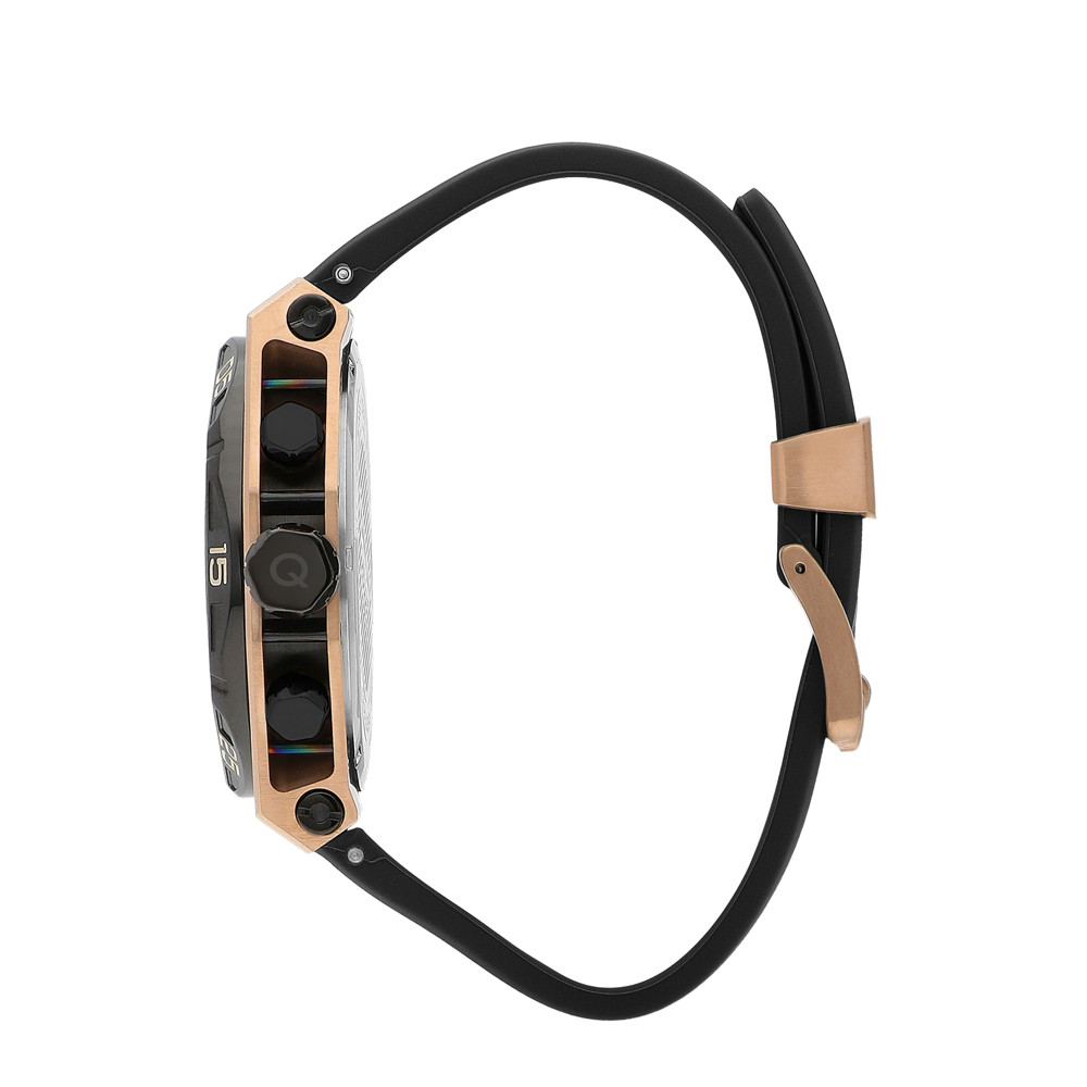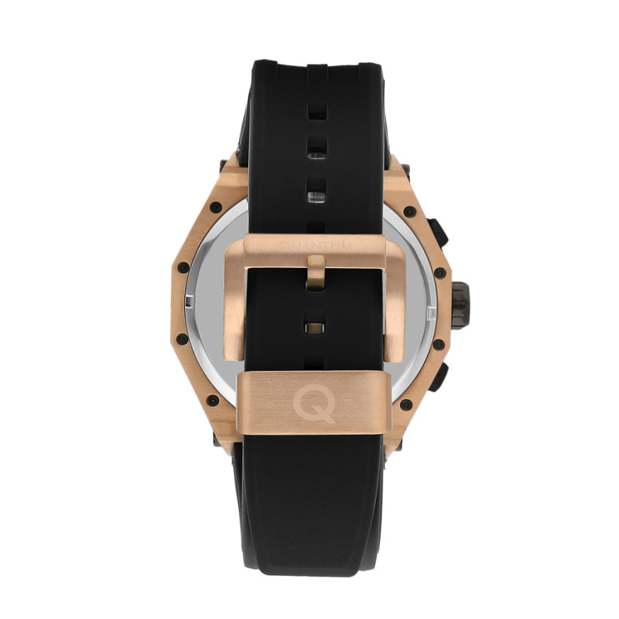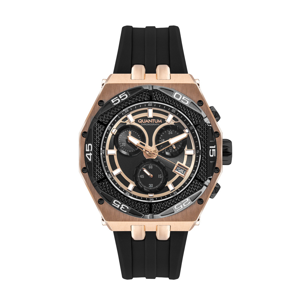 Мъжки часовник Quantum с интересен и модерен дизайн. Моделът е с дисплей хронограф. Стъкло минерал-кристал с антирефлексно покритие. Корпус от неръждаема стомана. Черна силиконова каишка. Задвижва се от кварцов механизъм. Водоустойчивост 10 ATM - позволява мокрене, къпане и плуване във водни басейни.