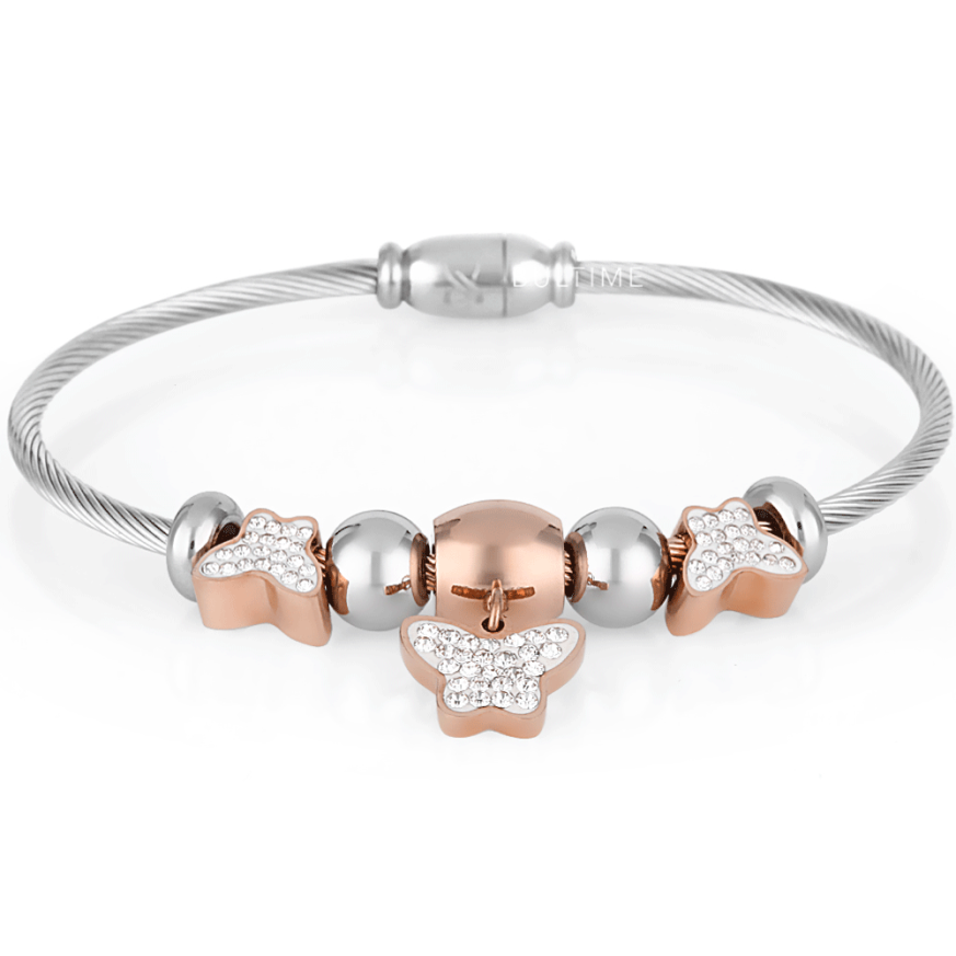 Дамска гривна Daniel Klein от неръждаема стомана в сребрист цвят. Моделът е акцентиран от детайли във формата на пеперуди в цвят розово злато, допълнени от бляскави кристали.