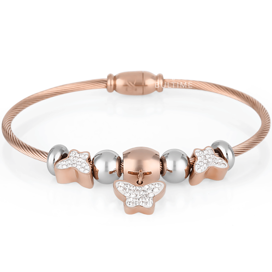 Дамска гривна Daniel Klein от неръждаема стомана в цвят розово злато. Моделът е акцентиран от детайли във формата на пеперуди, допълнени от бляскави кристали.