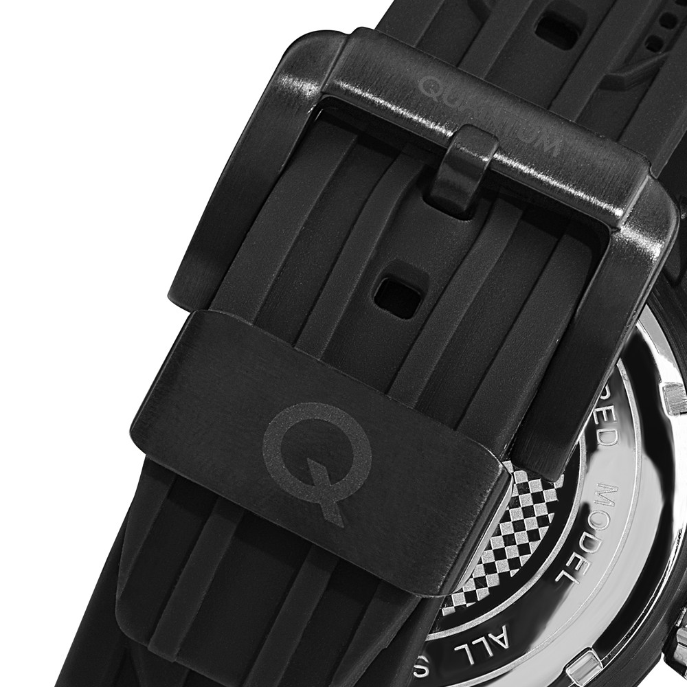 Мъжки часовник Quantum със спортен дизайн. Черен дисплей хронограф. Стъкло минерал-кристал с антирефлексно покритие. Корпус от неръждаема стомана. Силиконова каишка. Кварцов механизъм. Водоустойчивост 10 ATM - позволява мокрене, къпане и плуване във водни басейни.