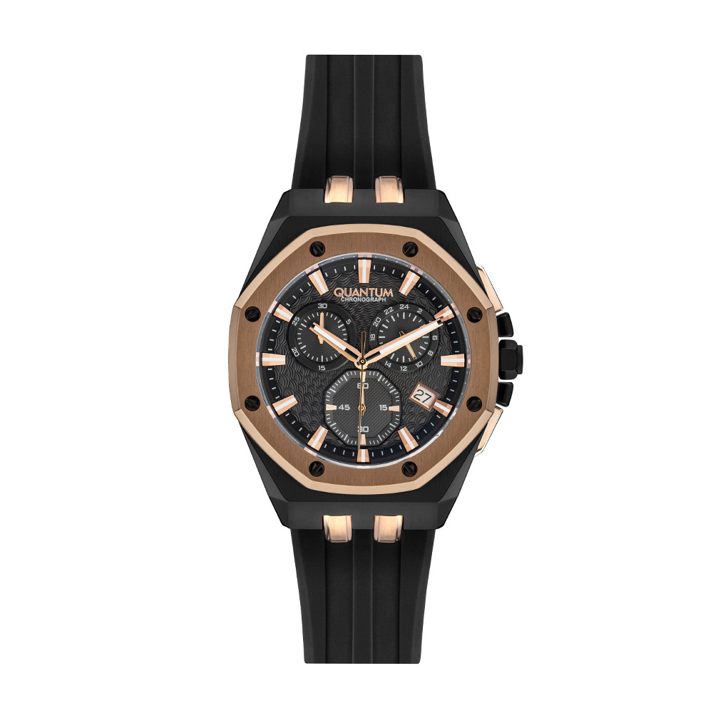 Мъжки часовник Quantum. Черен дисплей хронограф с детайли в цвят розово злато. Стъкло минерал-кристал. Корпус от неръждаема стомана в комбинация със силиконова каишка. Кварцов механизъм. Водоустойчивост 10 ATM - позволява мокрене, къпане и плуване във водни басейни.