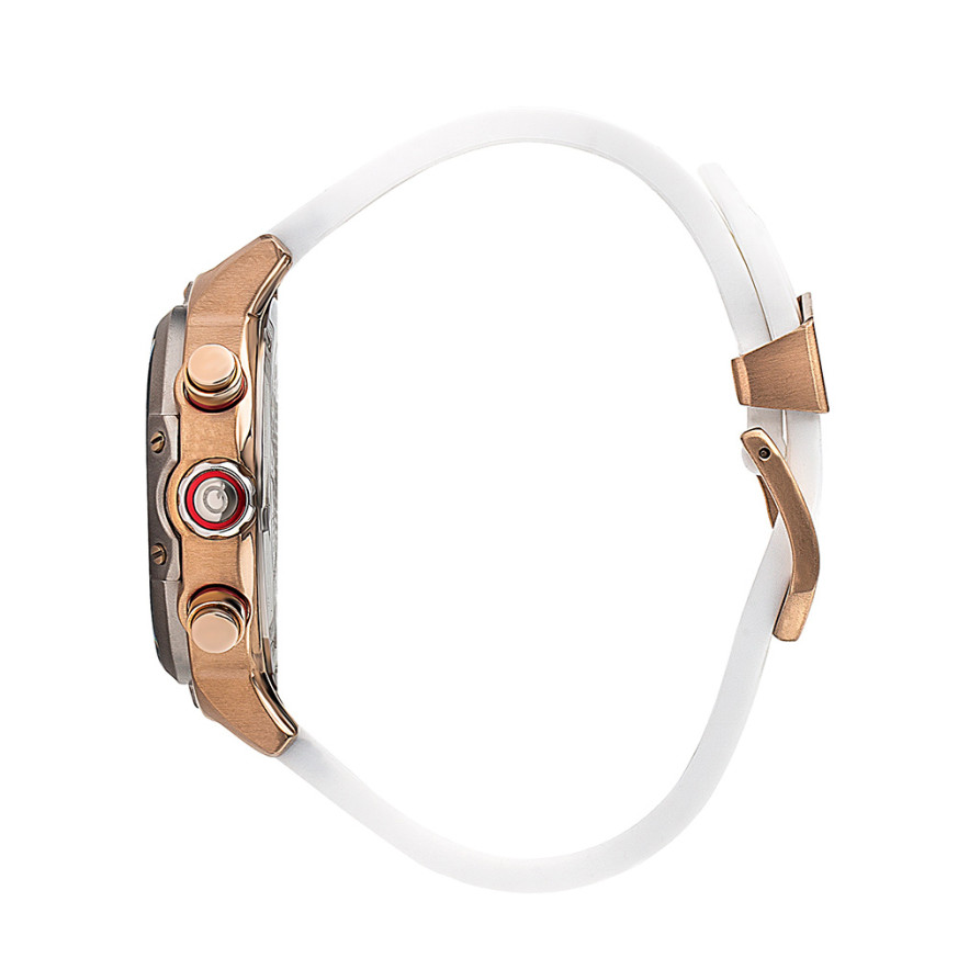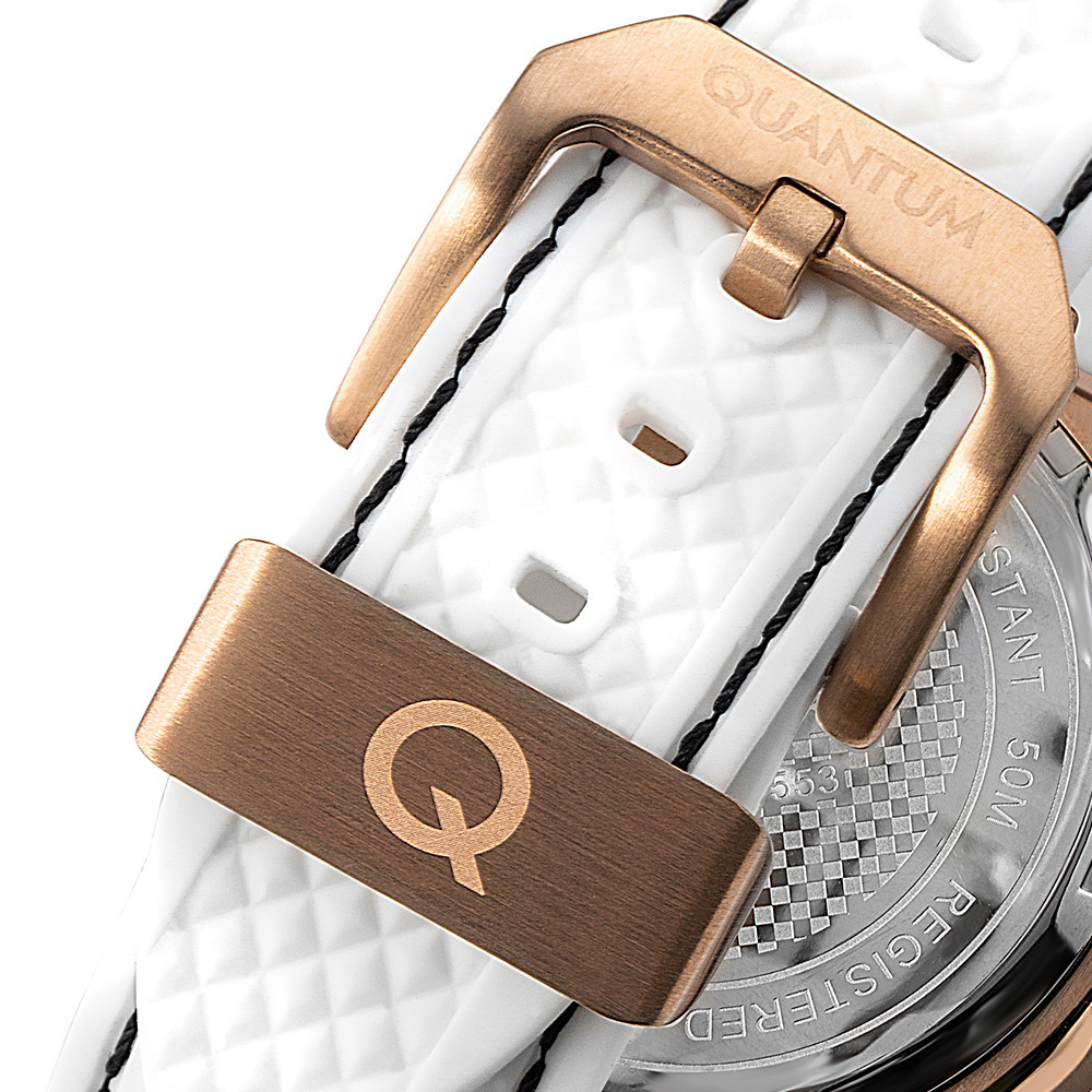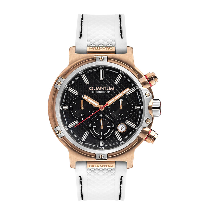 Мъжки часовник Quantum със спортно-елегантен дизайн. Черен дисплей хронограф. Стъкло минерал-кристал с антирефлексно покритие. Корпус от неръждаема стомана. Бяла силиконова каишка. Кварцов механизъм. Водоустойчивост 10 ATM - позволява мокрене, къпане и плуване във водни басейни.