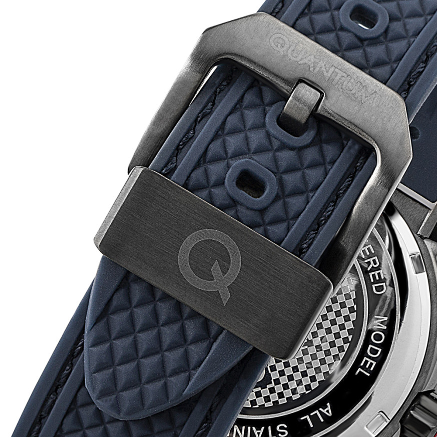 Мъжки часовник Quantum със спортно-елегантен дизайн. Тъмносин дисплей хронограф. Стъкло минерал-кристал с антирефлексно покритие. Корпус от неръждаема стомана съчетан със  силиконова каишка. Кварцов механизъм. Водоустойчивост 10 ATM - позволява мокрене, къпане и плуване във водни басейни.