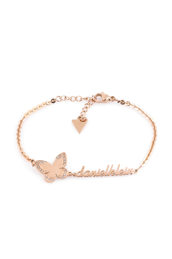 Дамска гривна Daniel Klein от неръждаема стомана в цвят розово злато. Моделът е с декоративен елемент пеперуда с нежни кристали.