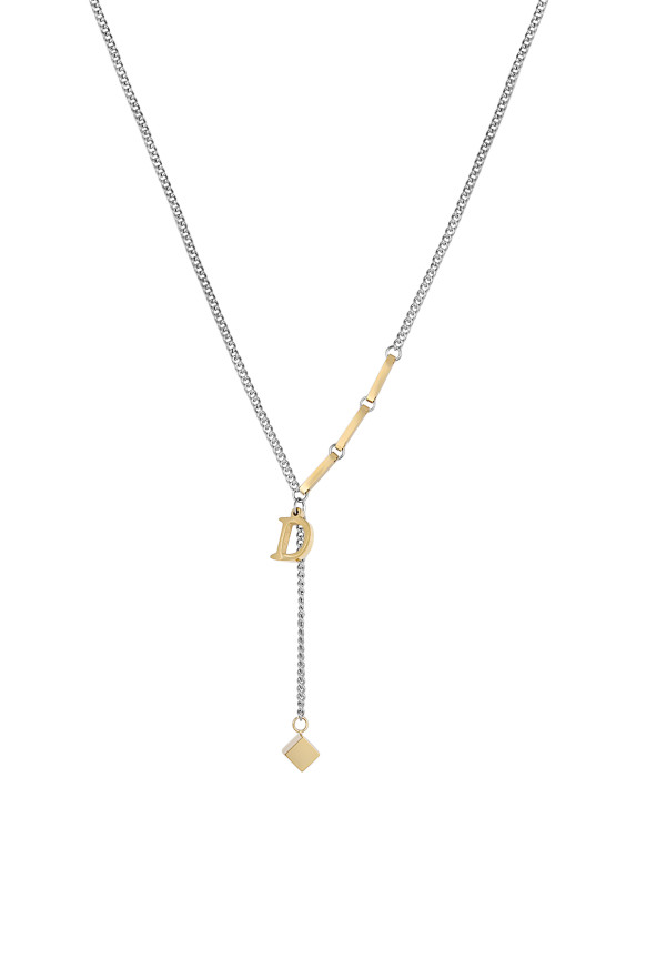 Дамско колие Daniel Klein с изчистен дизайн. Моделът е с декоративен елемент буквата "D" и кубче. Изработено е от неръждаема стомана.