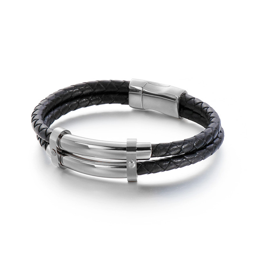 Двуредова мъжка гривна Lee Cooper, изработена от естествена кожа в черен цвят и декоративни елементи от неръждаема стомана в сребрист цвят.