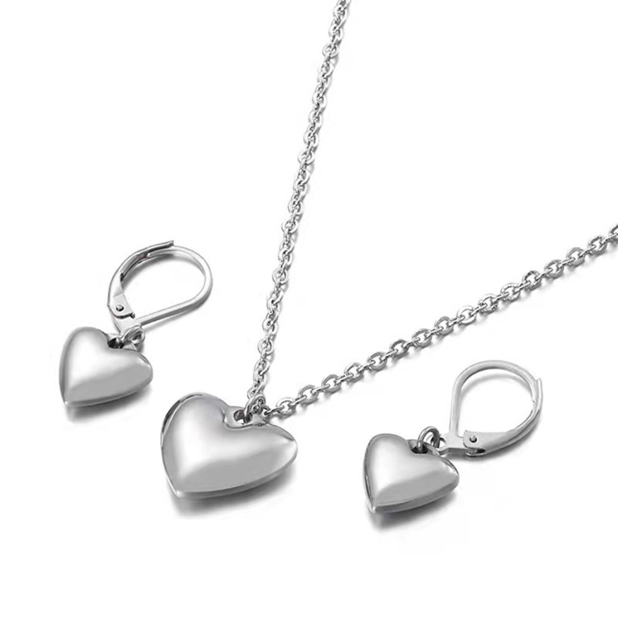 Комплект дамско колие с висулка и обеци във формата на сърце. Изработен е от неръждаема стомана в сребрист цвят.