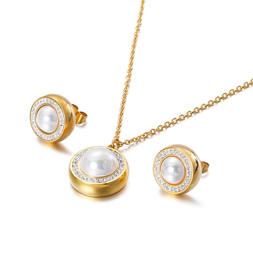 Нежен комплект дамско колие и обеци с елегантна визия. Моделът е изработен е от неръждаема стомана и е с инкрустирани кристали.