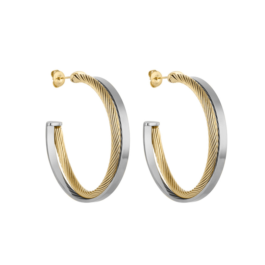 Дамски обеци тип халки Daniel Klein с интересен дизайн. Моделът е изработен от неръждаема стомана.
