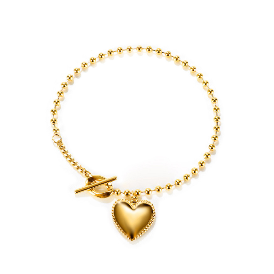 Нежен модел дамска гривна от неръждаема стомана, в цвят злато с декоративен елемент във формата на сърце. Дължина на гривната 170 мм.