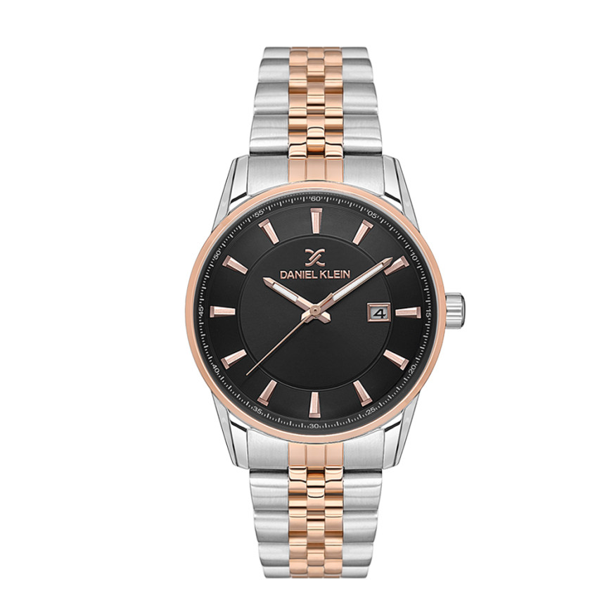 Мъжки часовник Daniel Klein с изчистен дизайн от колекцията Premium. Метален корпус в комбинация с верижка от неръждаема стомана. Черен аналогов дисплей с показател за дата и с детайли в цвят розово злато. Стъкло минерал-кристал. Задвижва се от кварцов механизъм. Водоустойчивост 5 ATM - допускат се леки пръски и взимане на душ, не се препоръчва обилно мокрене.