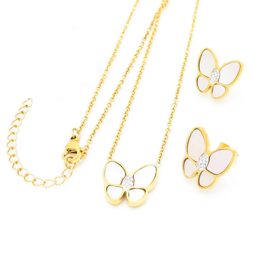 Стилен комплект дамско колие и обеци, изработени от неръждаема стомана с декорация от седеф и нежни кристали.