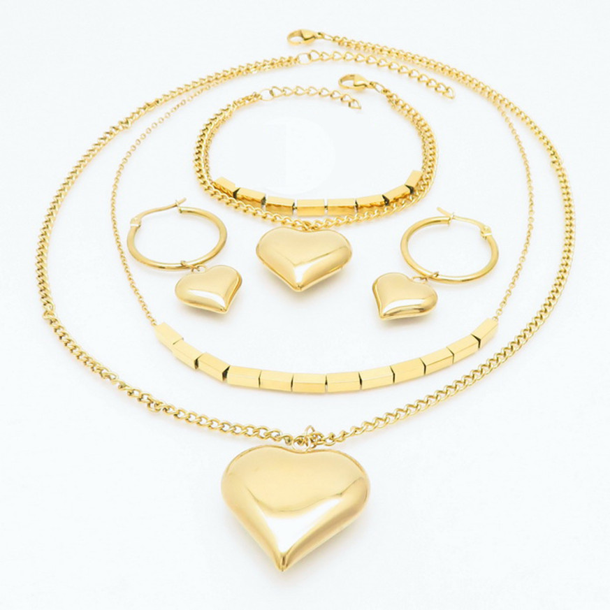 Комлект дамски бижута Lee Cooper с нежен дизайн. Комплектът включва колие, гривна и обеци, изработени от неръждаема стомана. Моделът е с декоративен елемент сърце.