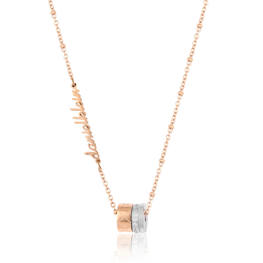 Нежно дамско колие Daniel Klein изработено от неръждаема стомана. Моделът е с декоративни елементи тип пръстен с инкрустирани кристали и изписано името на бранда.