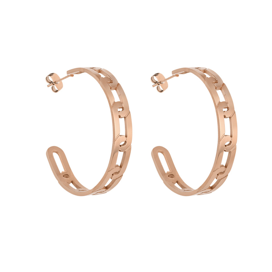 Дамски обеци тип халки с интересен дизайн. Изработени от неръждаема стомана. Моделът е със закопчаване на винт.