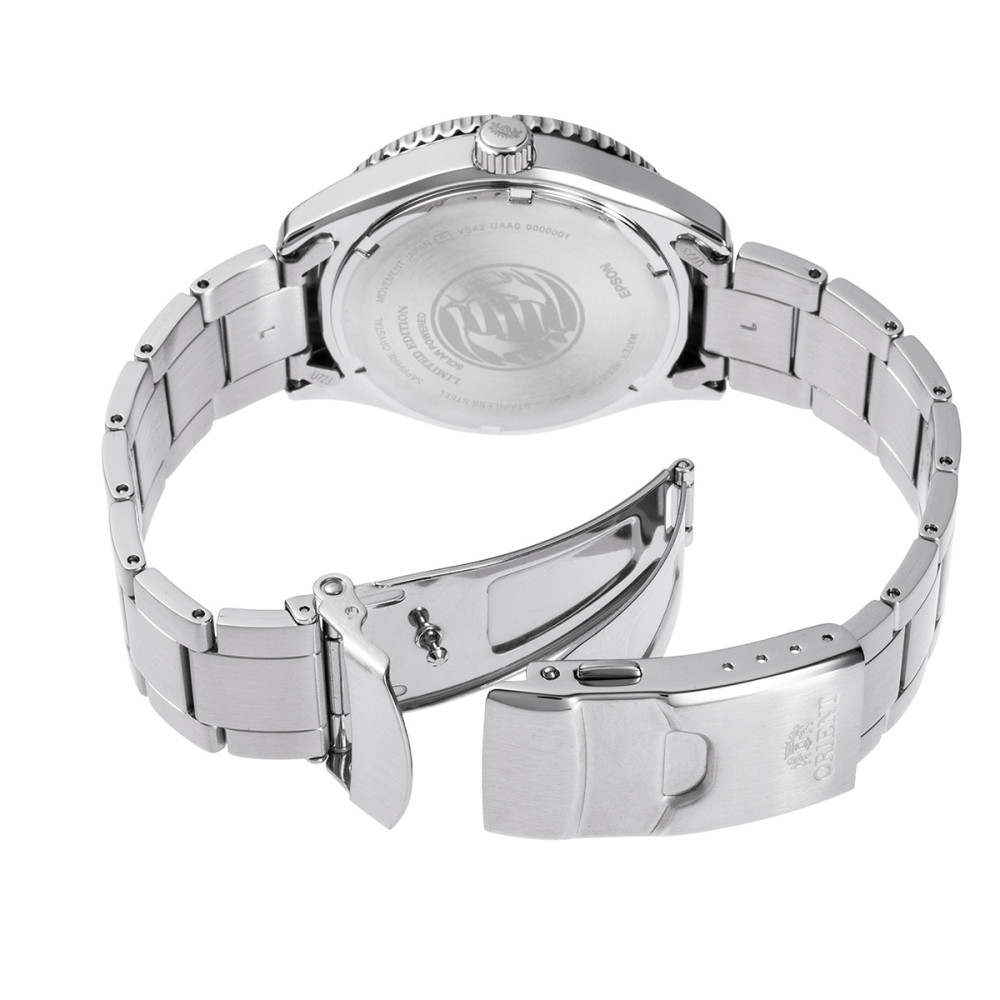 Orient RA-WJ0005L е соларен мъжки часовник със спортен водолазен дизайн и компактен корпус с диаметър 39.9 мм. Отличава се със син аналогов дисплей, луминесцентни стрелки и сив алуминиев безел с въртящ се механизъм. Създаден за активен начин на живот, моделът разполага с корпус и верижка от благородна стомана, винтова коронка и гръб, както и водоустойчивост до 20 ATM – идеален за плуване и гмуркане. Сапфир-кристалът гарантира отлична устойчивост към надраскване.