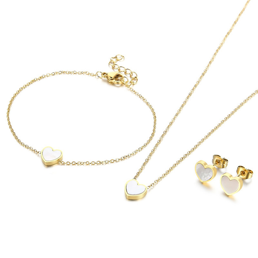 Очарователен дамски комплект Lee Cooper с нежен и елегантен дизайн. Моделът е изработен от неръждаема стомана, декоративни елементи във формата на сърце с инкрустация от седеф. Комплектът включва колие, гривна и обеци.