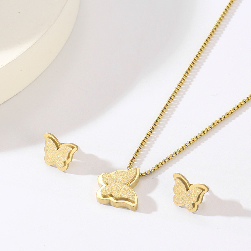 Красив дамски комплект Lee Cooper с нежен дизайн, декоративни елементи във формата на пеперуда. Моделът е изработен от неръждаема стомана със златисто покритие. Комплектът включва колие и обеци.