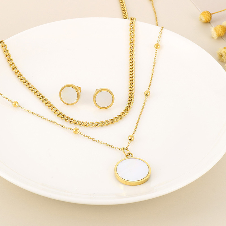 Стилен дамски комплект включващ колие и обеци Lee Cooper с красив дизайн. Моделът е изработен от неръждаема стомана с декорация от нежен седеф.