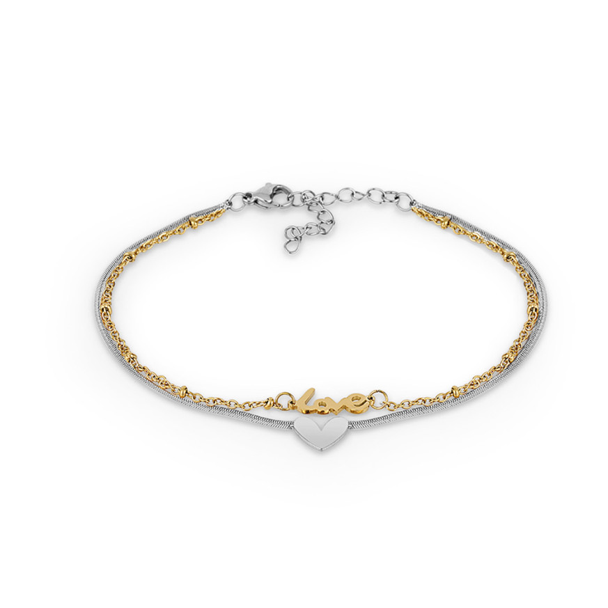 Нежна дамска гривна Daniel Klein с двойна верижка, изработена от неръждаема стомана с декоративен елемент сърце и надпис "Love".