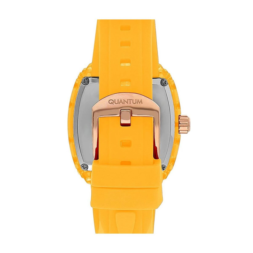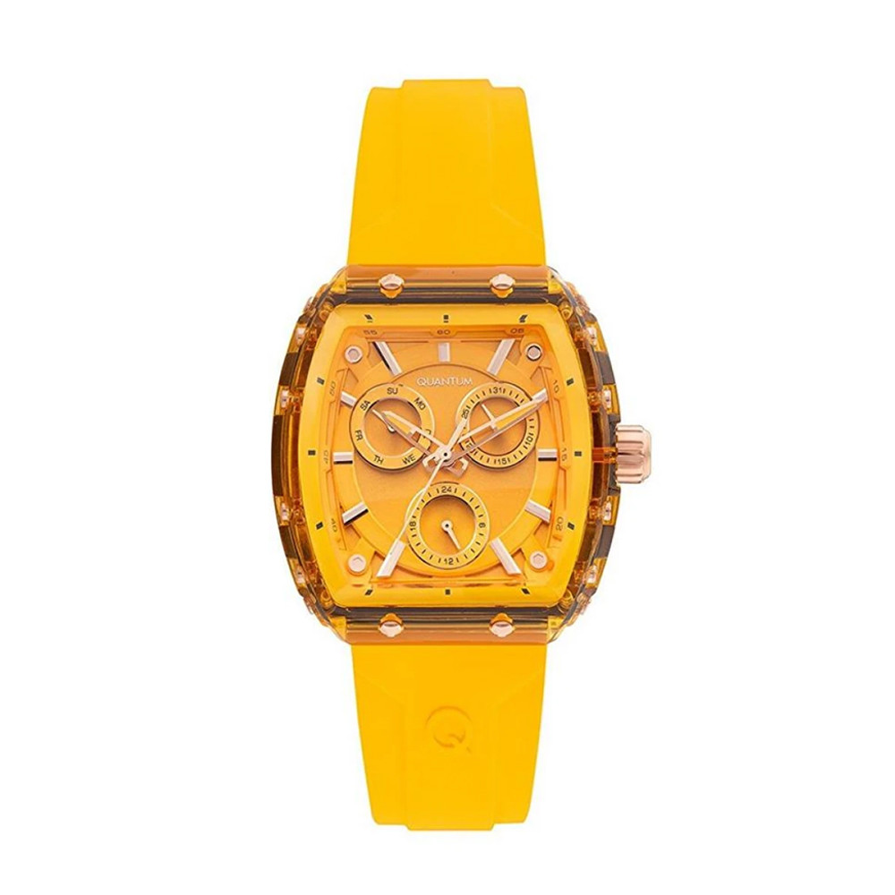 Дамски часовник Quantum с модерна спортна визия в жълт цвят. Мултифункционален дисплей с показатели за дата, ден от седмицата и 24-часов формат. Стъкло минерал-кристал. Моделът е с корпус от полимер и силиконова каишка. Часовникът се задвижва от кварцов механизъм. Водоустойчивост 5 ATM - допускат се леки пръски и взимане на душ, не се препоръчва обилно мокрене.