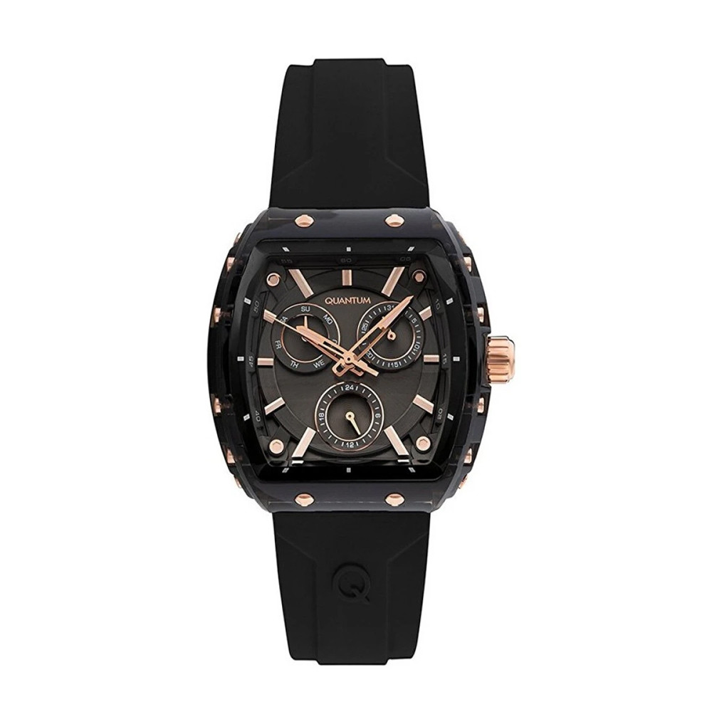 Дамски часовник Quantum с модерна спортна визия в черен цвят. Мултифункционален дисплей с показатели за дата, ден от седмицата и 24-часов формат. Стъкло минерал-кристал. Моделът е с корпус от полимер и силиконова каишка. Часовникът се задвижва от кварцов механизъм. Водоустойчивост 5 ATM - допускат се леки пръски и взимане на душ, не се препоръчва обилно мокрене.