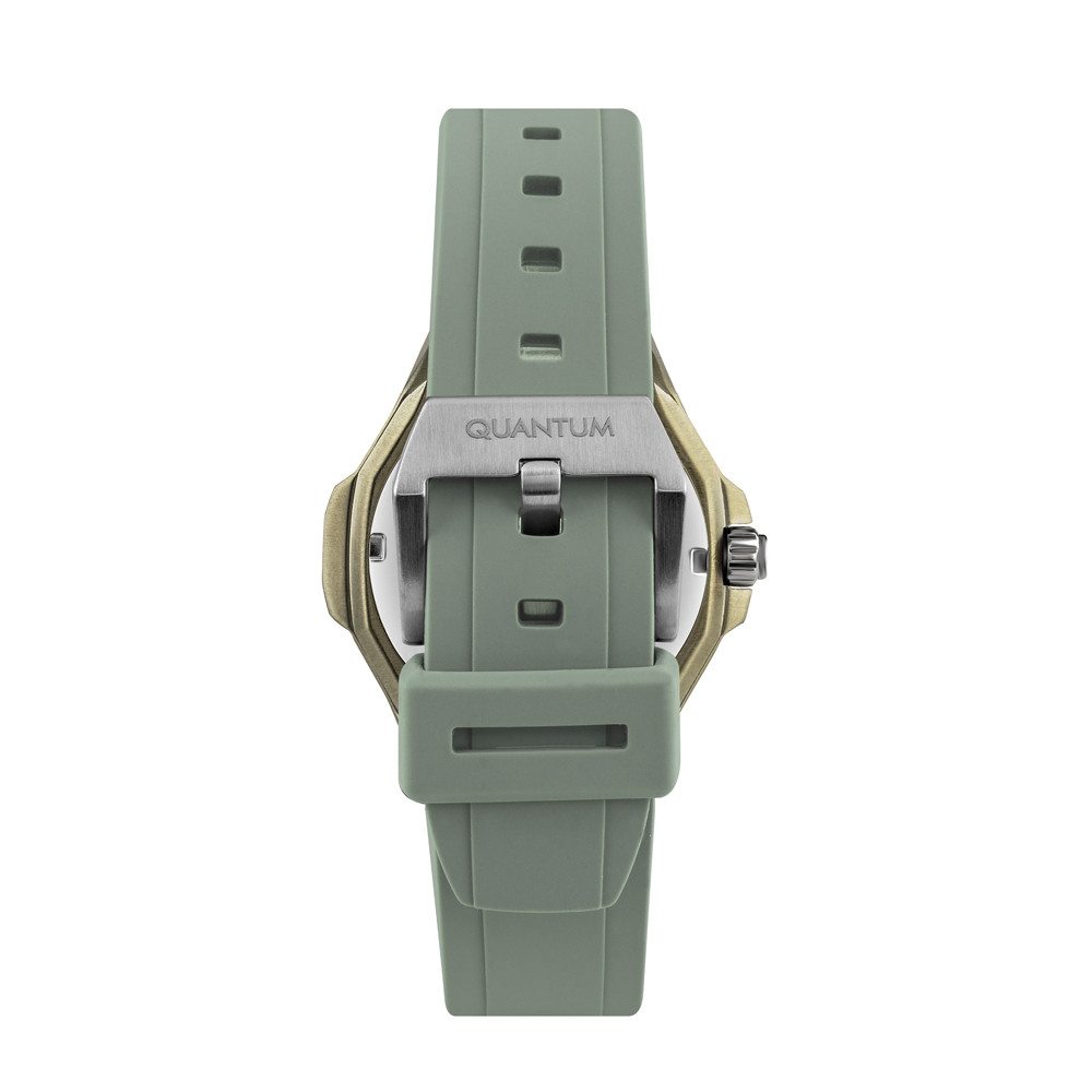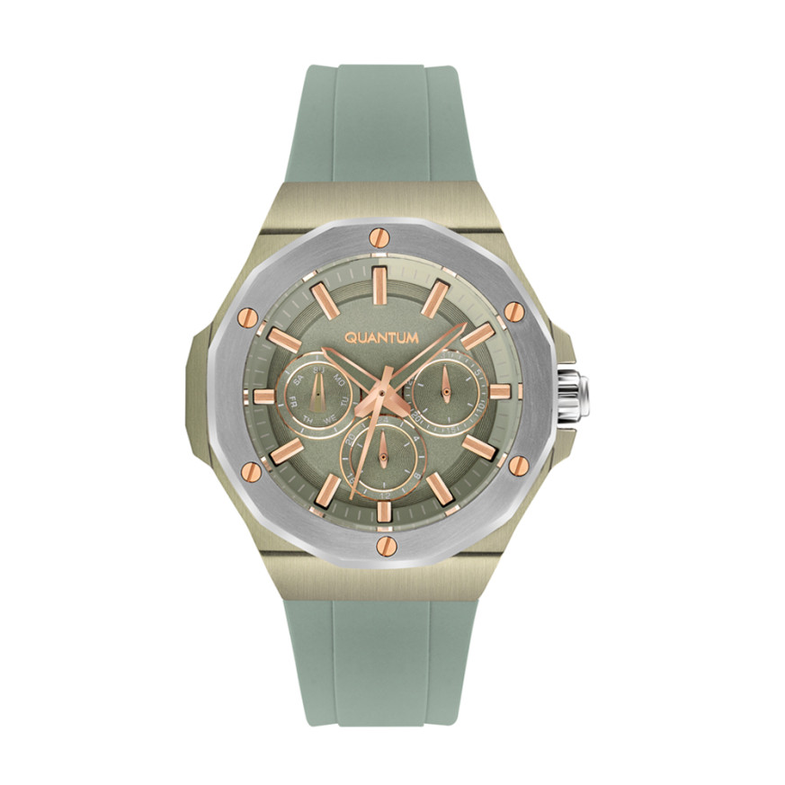 Дамски часовник Quantum с модерна спортна визия. Мултифункционален дисплей с показатели за дата, ден от седмицата и 24-часов формат. Стъкло минерал-кристал. Корпус от неръждаема стомана. Силиконова каишка в светлозелен цвят. Диаметър на корпуса 38 мм. Часовникът се задвижва от кварцов механизъм. Водоустойчивост 5 ATM - допускат се леки пръски и взимане на душ, не се препоръчва обилно мокрене.