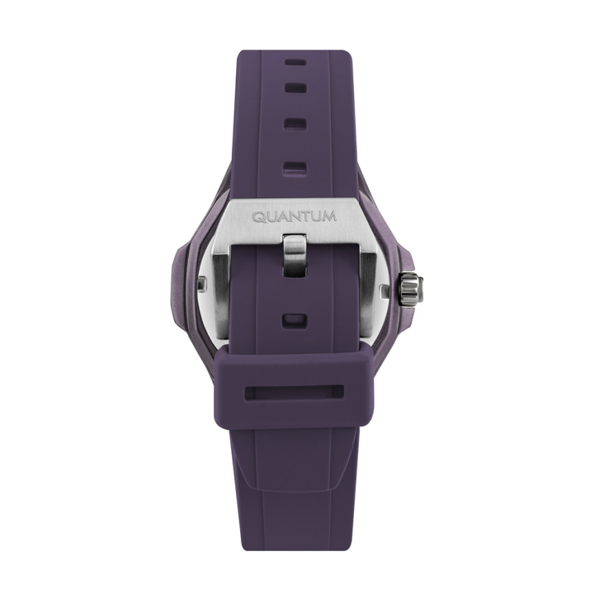 Дамски часовник Quantum с модерна спортна визия. Мултифункционален дисплей с показатели за дата, ден от седмицата и 24-часов формат. Стъкло минерал-кристал. Корпус от неръждаема стомана. Силиконова каишка в лилав цвят. Диаметър на корпуса 38 мм. Часовникът се задвижва от кварцов механизъм. Водоустойчивост 5 ATM - допускат се леки пръски и взимане на душ, не се препоръчва обилно мокрене.
