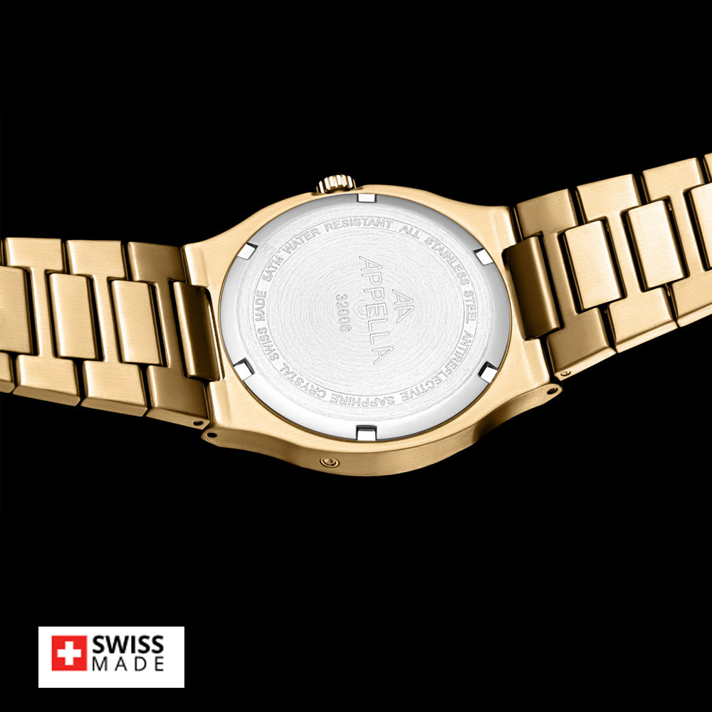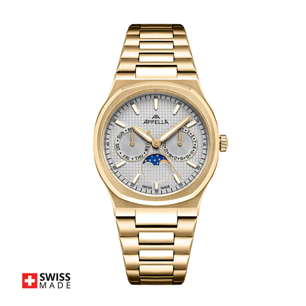 Часовник Appella L32006.1117QF – изискан дамски модел, който съчетава спортен дух и швейцарска прецизност. Мултифункционалният циферблат показва дата, ден от седмицата и фаза на луната, а луминисцентните стрелки осигуряват отлична видимост при всякакви условия. Корпусът и верижката от благородна стомана подчертават елегантността, докато сапфир-кристалът с антирефлексно покритие предпазва от надраскване. Надеждният кварцов механизъм RONDA 706 Swiss Made гарантира точност и качество – идеален избор за модерната дама.