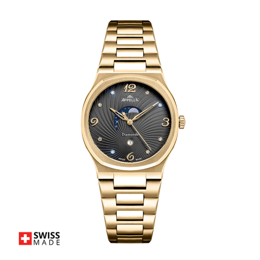 Часовник Appella L32006.1176DQS – Дамски швейцарски часовник с лунна фаза, диаманти и златист корпус