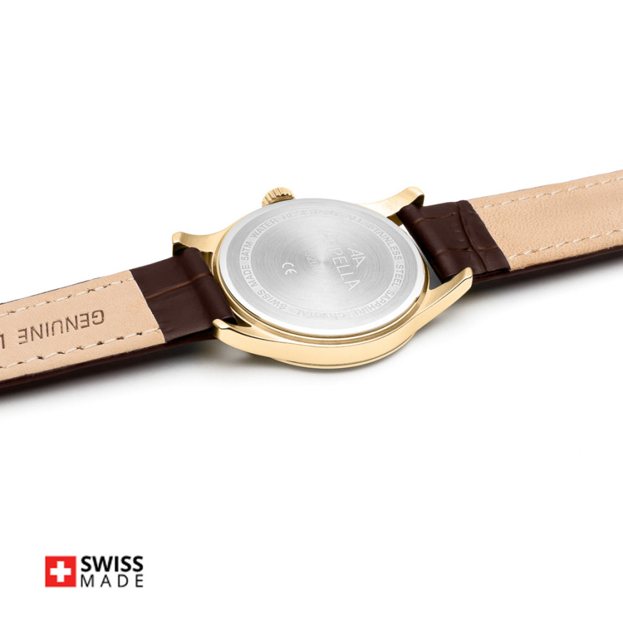 Часовник Appella L32004.1B61Q е част от колекцията Appella Classic и впечатлява с изискан, неподвластен на времето стил. Златистият аналогов циферблат с показател за дата придава на модела деликатен блясък и изтънчена визия. Корпусът от благородна стомана осигурява надеждност, а кафявата каишка от естествена кожа придава мекота и комфорт при носене. Сапфир-кристалното стъкло предпазва часовника от надрасквания, като запазва елегантния му вид. Задвижван от швейцарски кварцов механизъм ETA F04 Swiss Made, моделът гарантира висока точност и дълъг живот. С диаметър на корпуса 31 мм и водоустойчивост 5 ATM, този часовник е идеалният избор за дами, които търсят комбинация от класика, качество и комфорт.