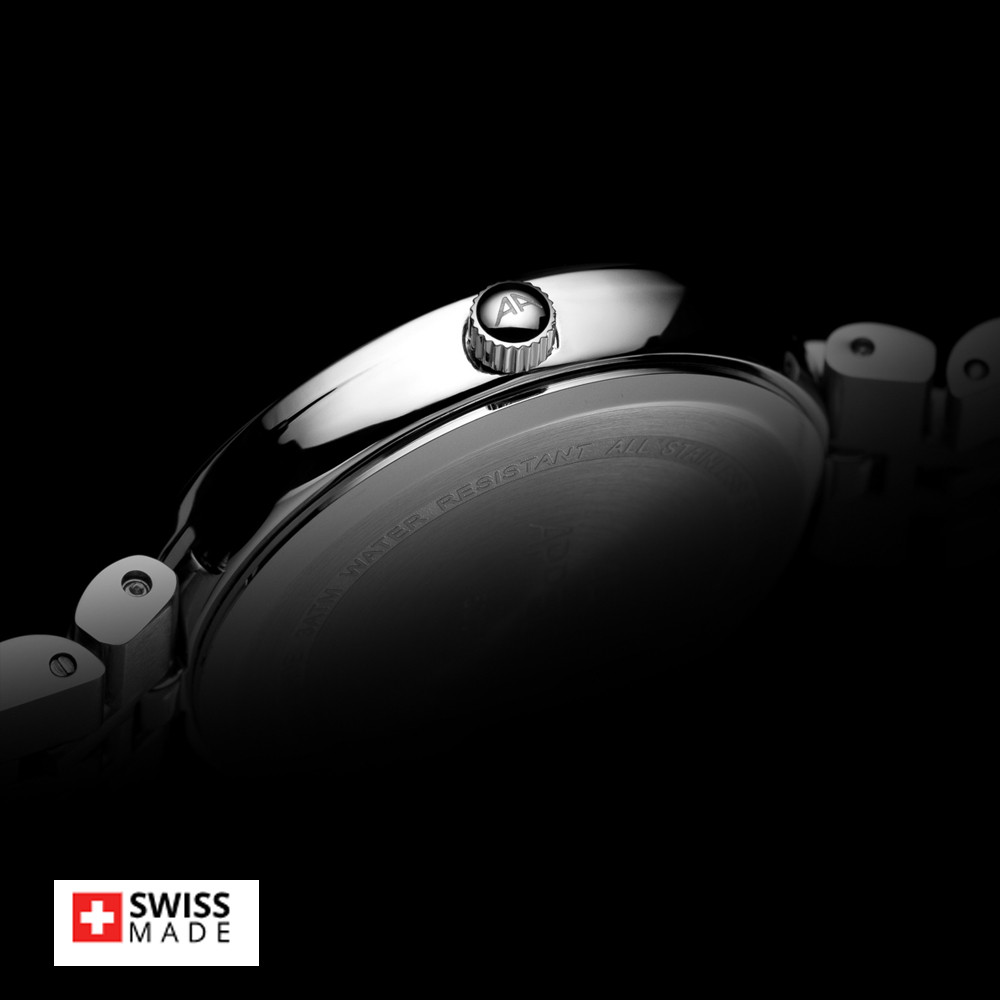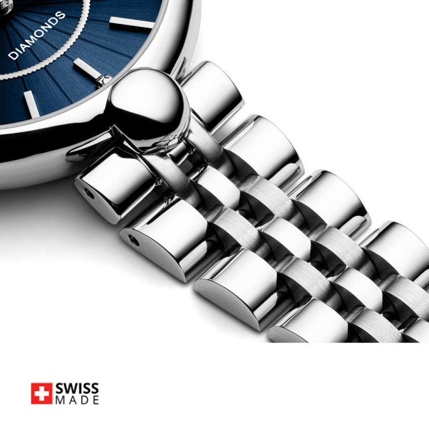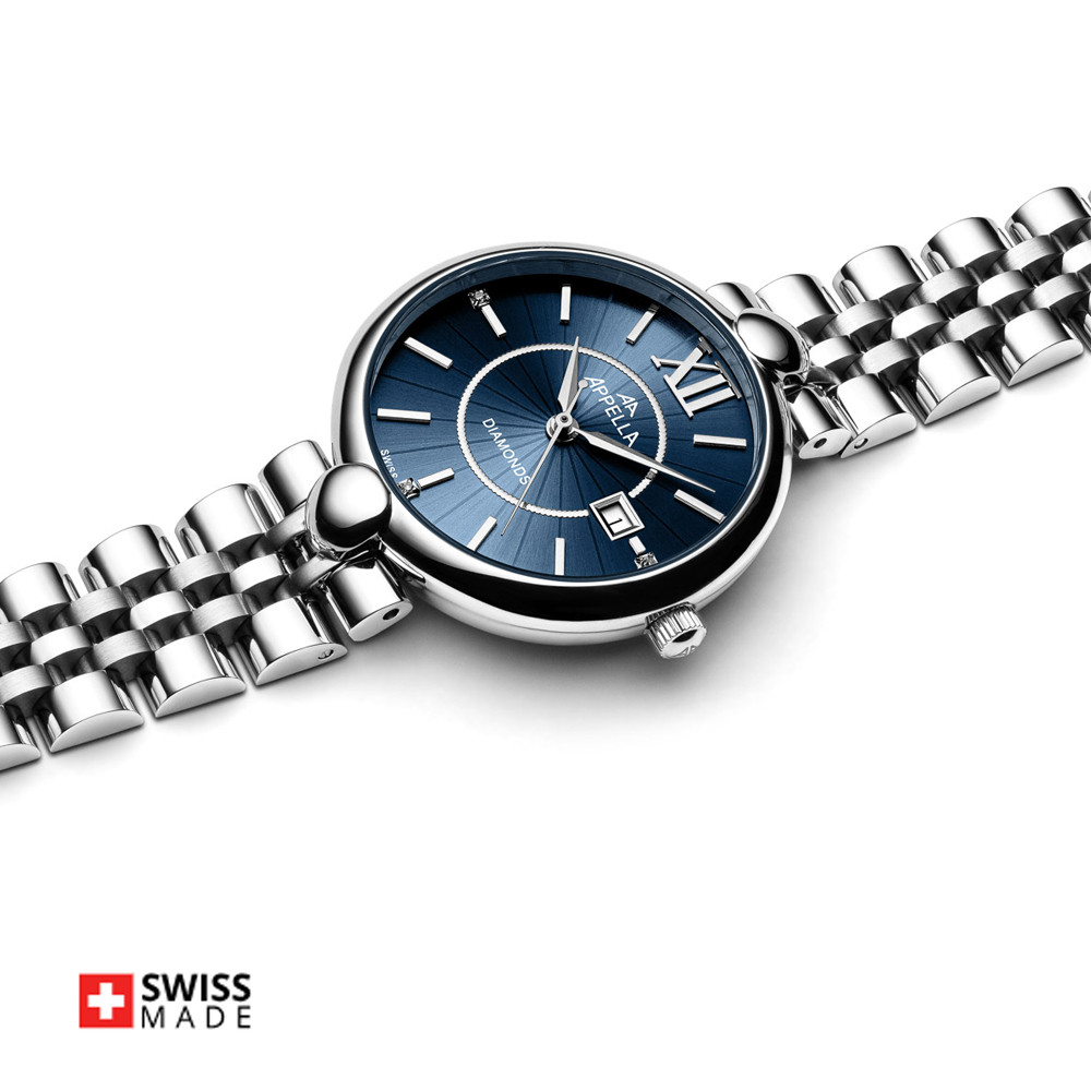 Часовник Appella L50011.5165DQ е елегантен дамски модел, съчетаващ изискан дизайн и швейцарска точност. Корпусът и верижката от благородна стомана придават модерен и устойчив вид, а тъмносиният циферблат с деликатни диамантени акценти излъчва женственост и стил. Сапфир-кристалното стъкло с антирефлексно покритие предпазва повърхността от надрасквания и осигурява отлична видимост. Моделът се задвижва от надеждния швейцарски кварцов механизъм ETA F04 Swiss Made, а водоустойчивостта до 3 ATM го прави подходящ за ежедневно носене. Перфектен избор за дами, които ценят финия детайл и класата на швейцарската изработка.