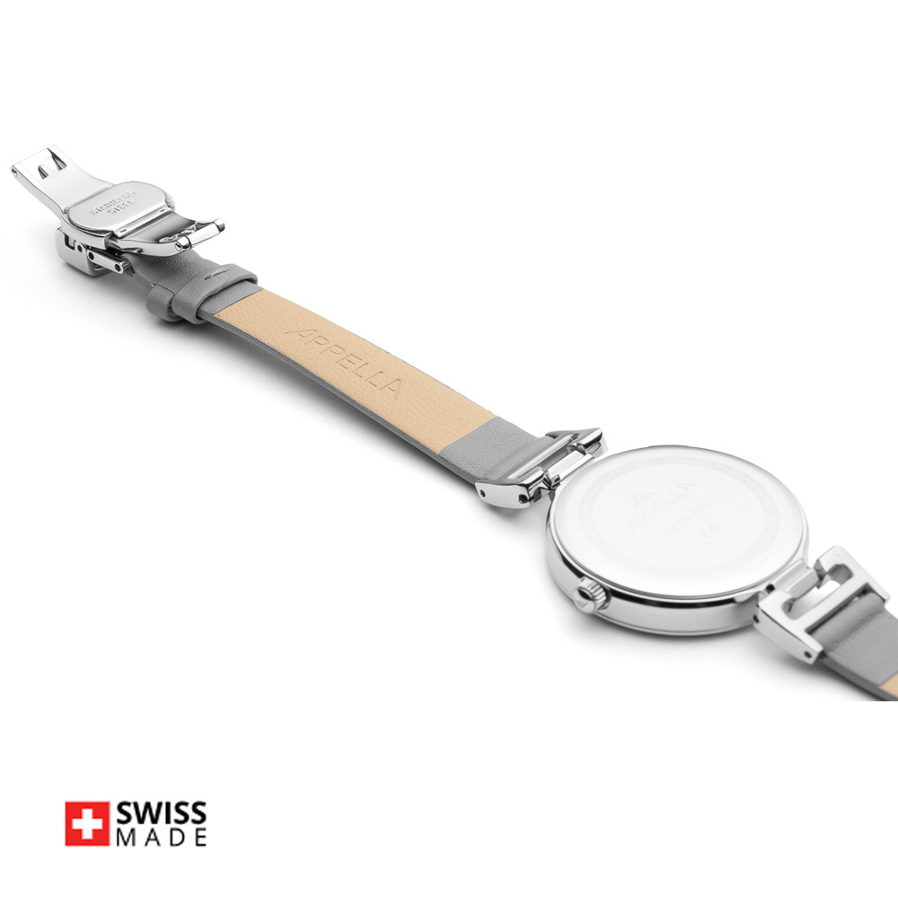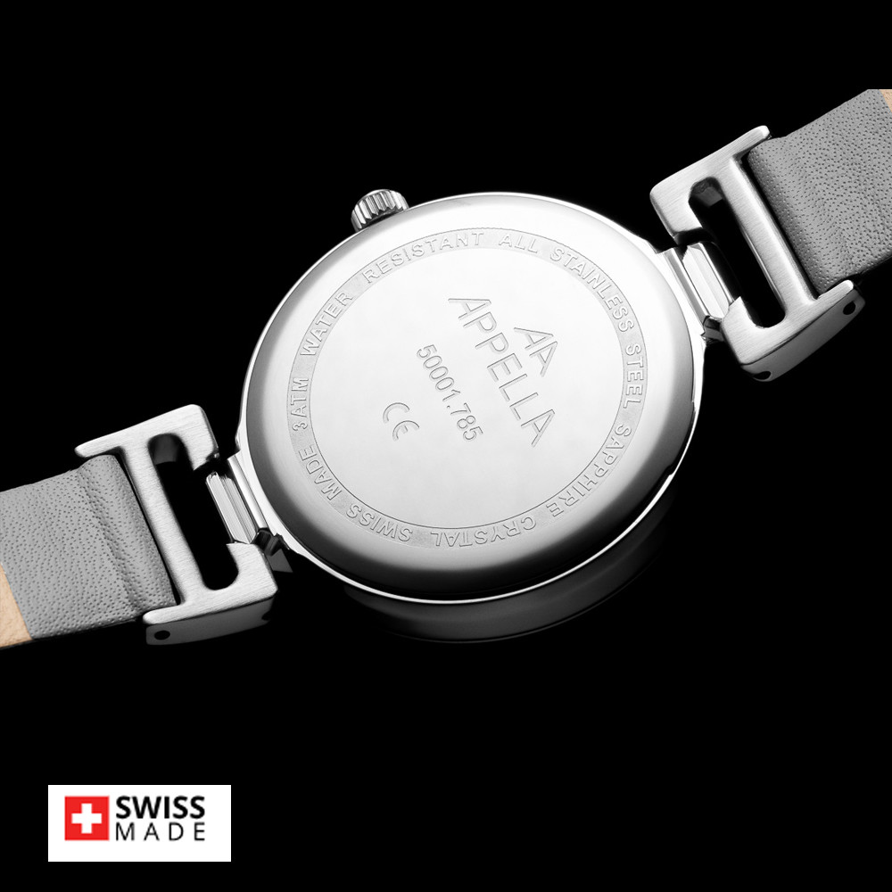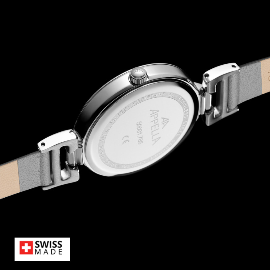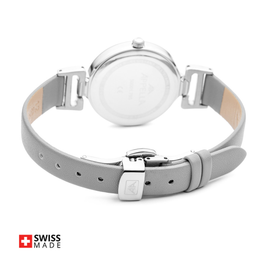 Часовник Appella L50001.5G87DQ е елегантен дамски модел, който съчетава класически стил и швейцарска прецизност. Корпусът и верижка от благородна стомана създават изтънчен баланс между комфорт и елегантност. Сивият циферблат, декориран с осем диаманта и индикатор за дата, придава усещане за лукс и женственост. Моделът се задвижва от висококачествен швейцарски кварцов механизъм ETA F04 Swiss Made, осигуряващ точност и надеждност. Сапфир-кристалното стъкло предпазва повърхността от надрасквания, а водоустойчивостта до 3 ATM позволява ежедневно носене.