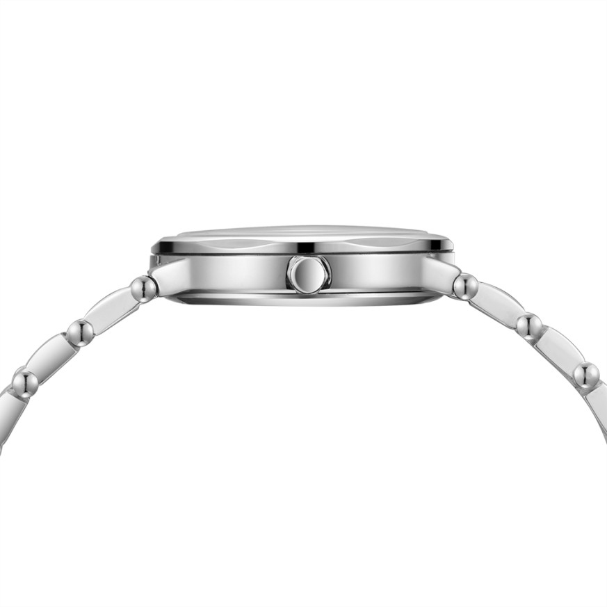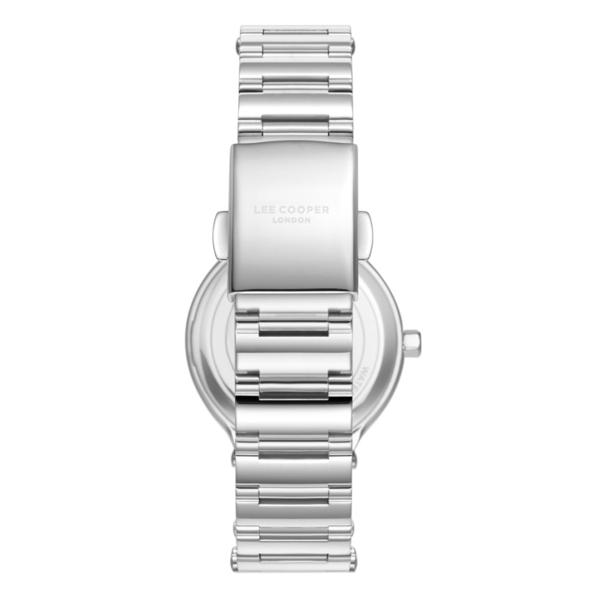 Дамски часовник Lee Cooper с корпус от супер метал и верижка от неръждаема стомана. Сребрист аналогов дисплей със стрелки и индекси в цвят розово злато. Стъкло минерал-кристал. Задвижва се от кварцов механизъм. Водоустойчивост 3 ATM - допускат се леки пръски, не се препоръчва обилно мокрене.